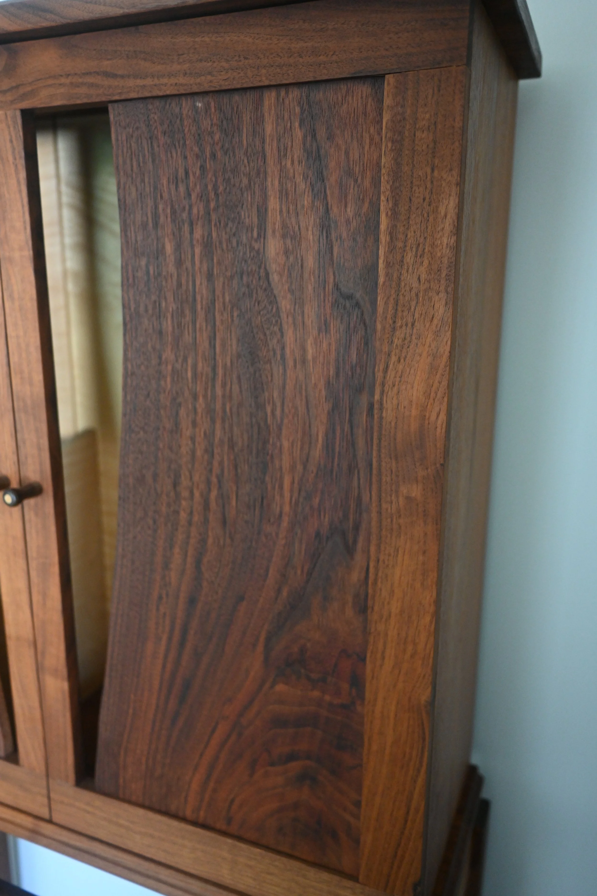 Sometimes a piece of wood catches my eye and I buy it, while not knowing what I will use it for. A thick piece of walnut with a live edge which makes up the two front panels was one of those purchases. It sat in my shop for about a year until I came up with the idea of having frame and panel doors with a “live edge, open” look, thus maintaining the natural contour of this beautiful piece.