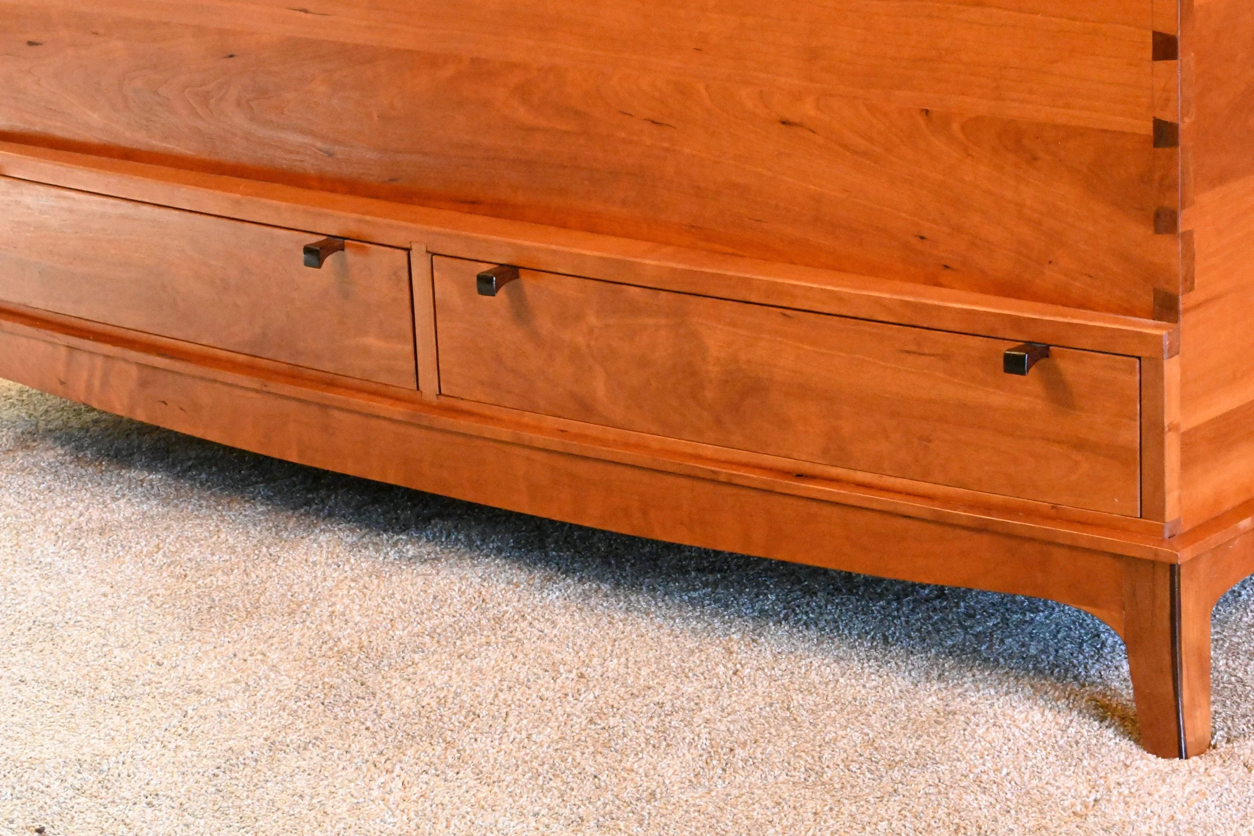 This cherry blanket chest was a project I wanted to pursue for years. Designed with careful attention to detail, this piece blends traditional joinery with distinctive modern curves for a look that’s both timeless and unique.