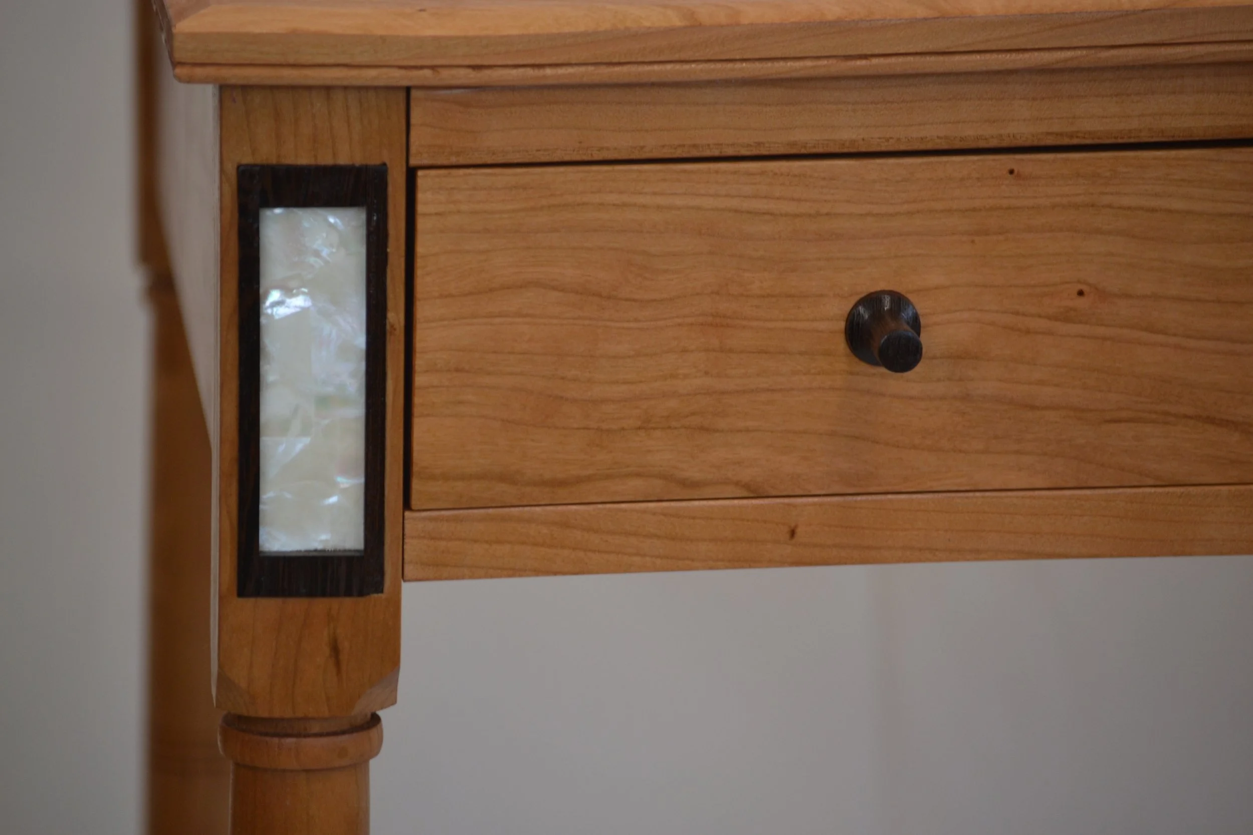 Turned Legs with Abalone Inlay: Turned legs bring a classic elegance, each crowned with an abalone inlay at the top—adding a touch of detail that catches the light and the eye.
