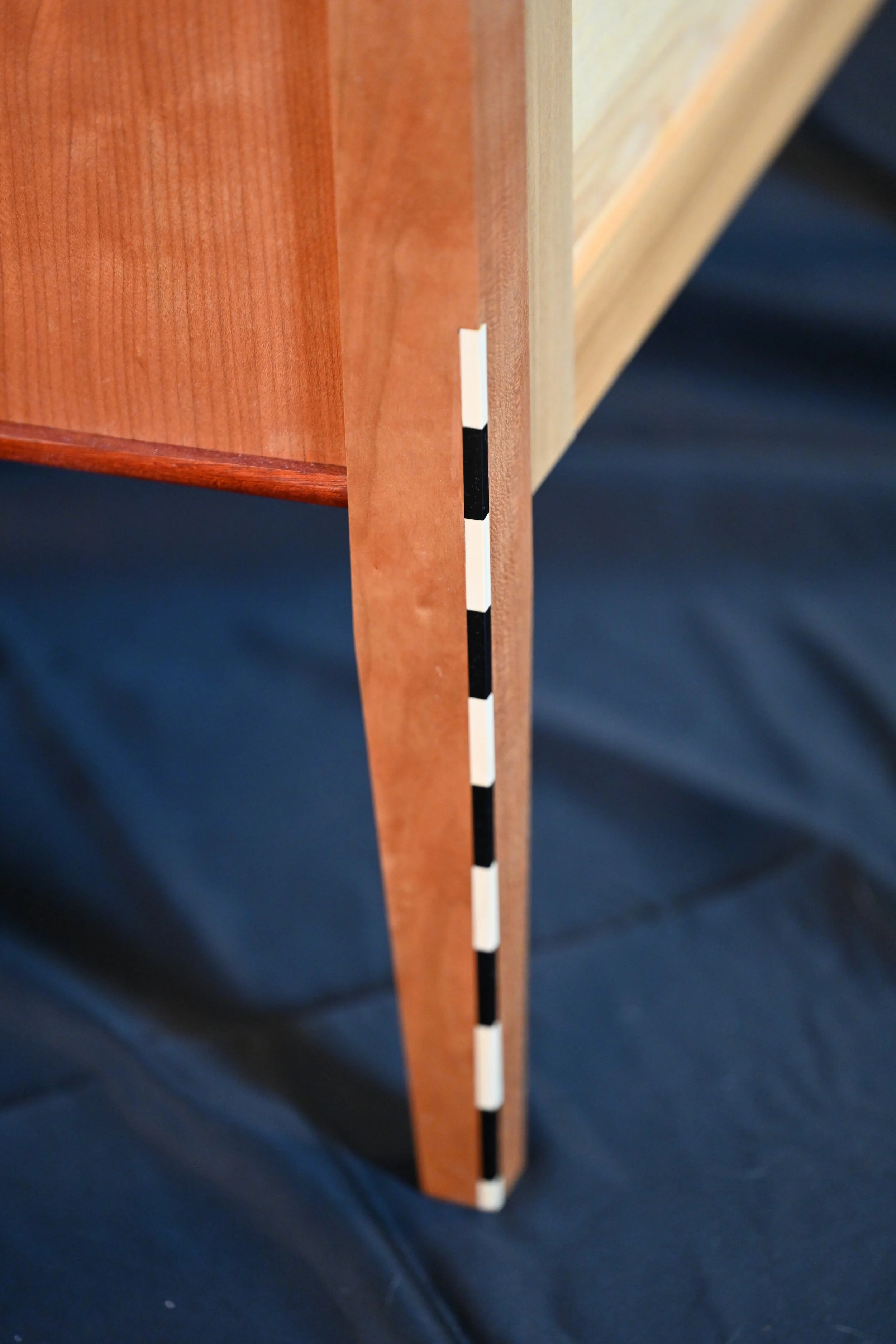 Alternating Inlay Leg Detail: The legs feature a distinctive alternating inlay design with ebony and holly.