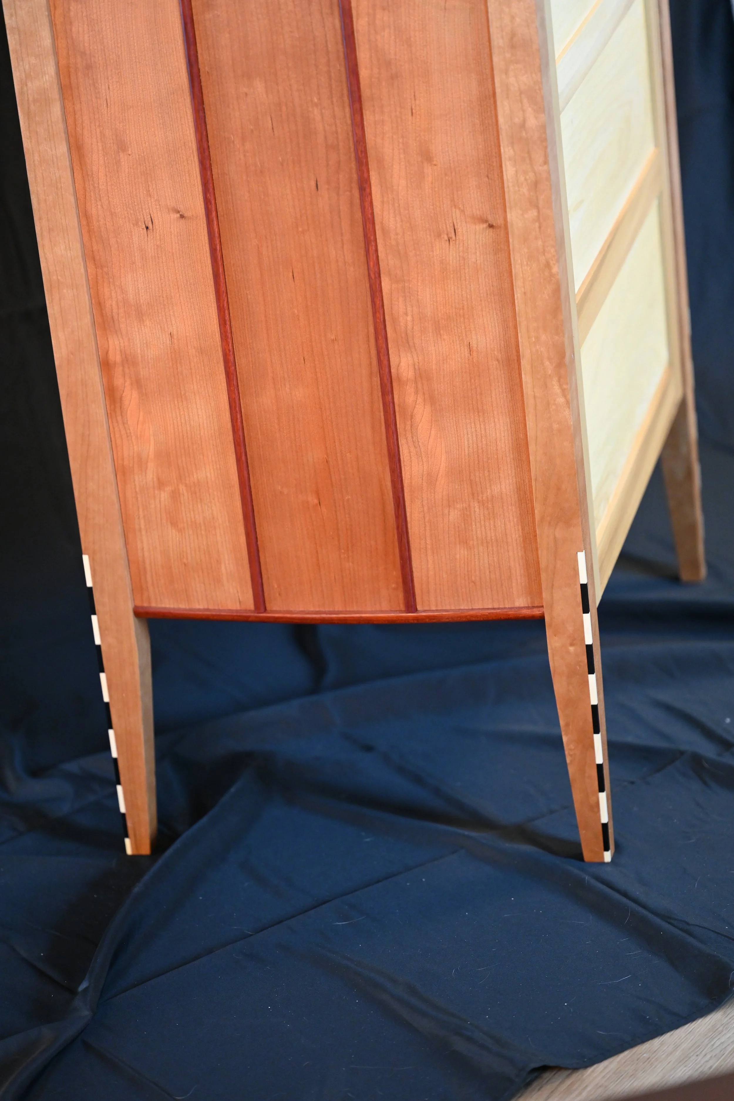 Curved Cherry Sides with Bloodwood Accents: The gentle convex sides are crafted from quartersawn cherry veneer, divided into three vertical panels by half-round bloodwood splines. The deep red of the bloodwood provides bold contrast against the warm cherry, emphasizing the curvature and vertical rhythm of the design.