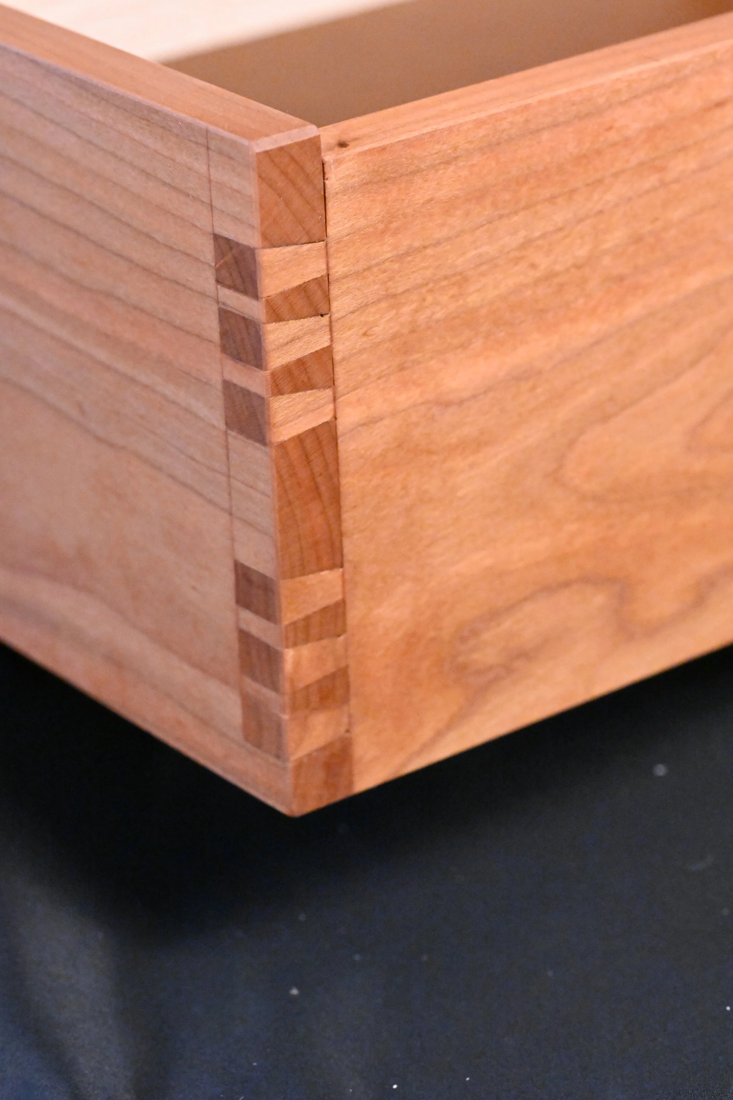Hand-Cut Dovetails: Each box features hand-cut through dovetails with a distinctive offset pattern, showcasing both structural integrity and a modern twist on a traditional joint.