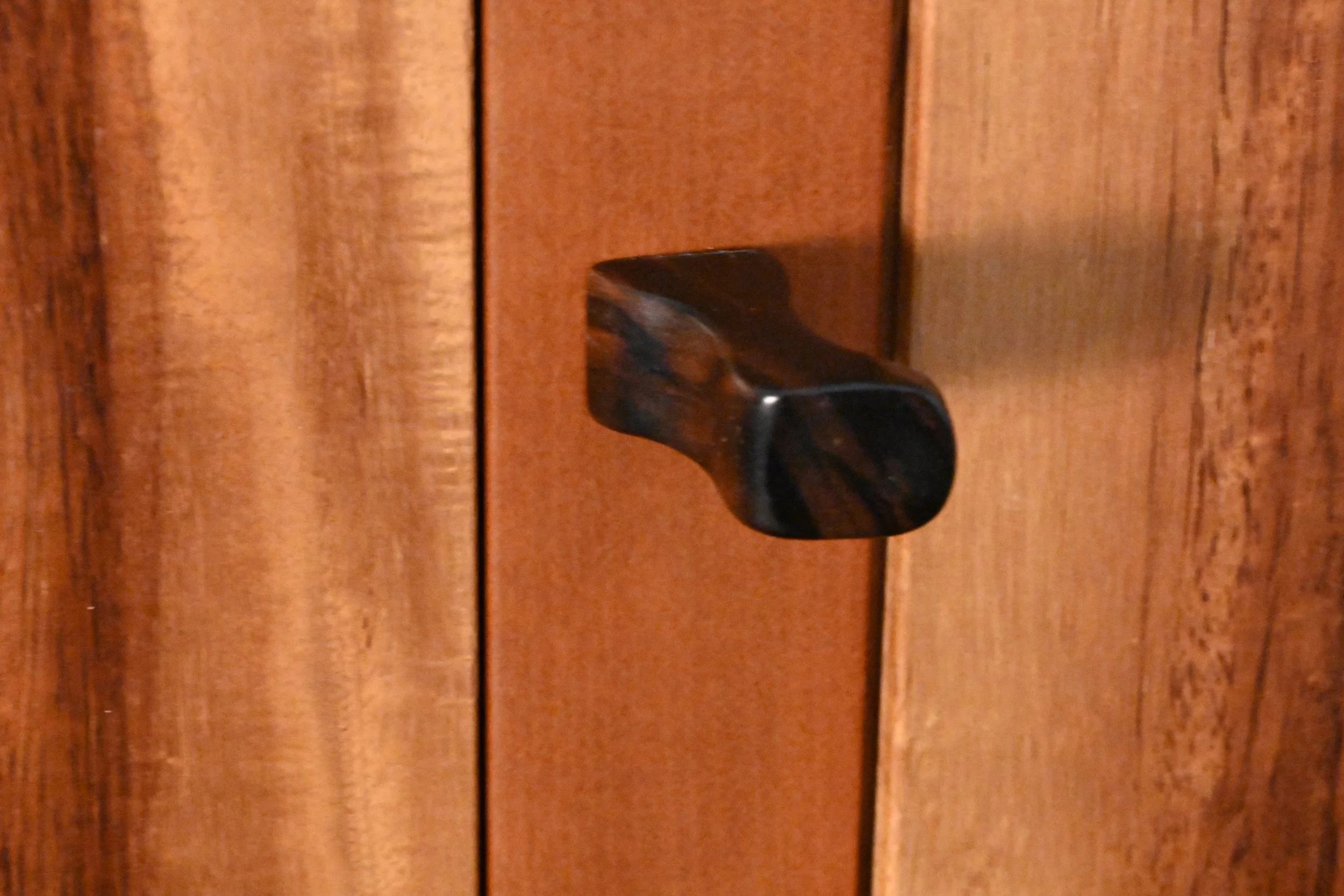Introducing an asymmetric Wall Clock. On the left, a slab of flame-grain canarywood commands attention, its natural “flames” glowing warmly, while the right side offers the restraint of a classic frame-and-panel door. Ebony rectangles mark each hour with minimalist boldness, and a hand-carved ebony pull on the right door ties together the dark accents with refined craftsmanship.